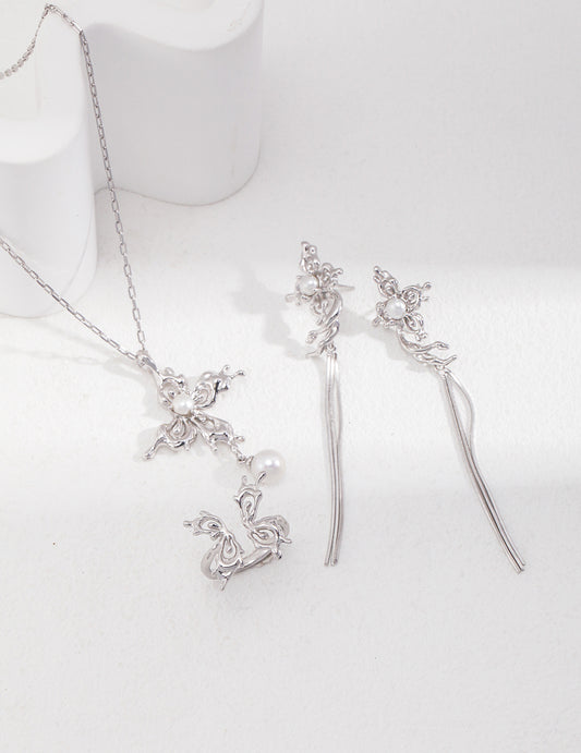 Artistic Pearl Silver Jewelry Set with Necklace, Earring and Ring
